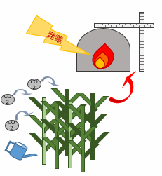 ■バイオマスとは、動植物などから生まれた生物資源の総称です。『バイオマス発電』は、この生物資源を「直接燃焼」したり「ガス化」するなどして発電します。光合成によりCO2を吸収して成長するバイオマス資源を燃料とした発電は「京都議定書」における取扱上、CO2を排出しないものとされています。未活用の廃棄物を燃料とする『バイオマス発電』は、廃棄物の再利用や減少につながり、循環型社会構築に寄与するメリットもあります。