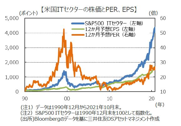 ■米国のITセクターは2021年10月末で最高値を更新しており、極めて好調です。株価収益率(PER)を見ると、2020年夏以降は25~28倍程度と高い水準で推移していますが、2000年のITバブルの頃の50倍超と比べれば、それほど高くはないと考えられます。
