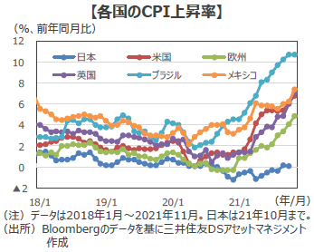 ■2021年は、世界の多くの国・地域において『インフレ』が加速し、歴史的な高水準となりました。米国の11月の消費者物価指数(CPI)の上昇率は前年同月比+6.8%に達し、約39年ぶりの高水準となりました。ユーロ圏の11月のCPI(速報値)は同+4.9%となり、統計を遡れる1997年以降で最大の伸びとなっています。英国の11月CPIも同+5.1%と、約10年ぶりの高さです。新興国でも、ブラジルの11月CPIが同+10.7%と約18年ぶり、メキシコの11月CPIは同+7.4%と約21年ぶりの高水準となりました。
