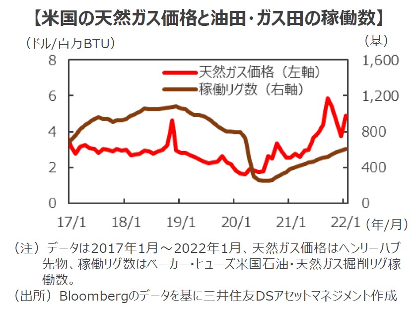 ■コロナ禍で低迷したエネルギー需要はその後の景気回復で着実に回復していますが、世界的な脱炭素の流れから化石燃料の開発投資は伸び悩んでいます。このため米国の天然ガス価格は2020年の初旬から約3倍に上昇していますが、油田やガス田の稼働数はコロナ禍前の8割弱に留まっています。