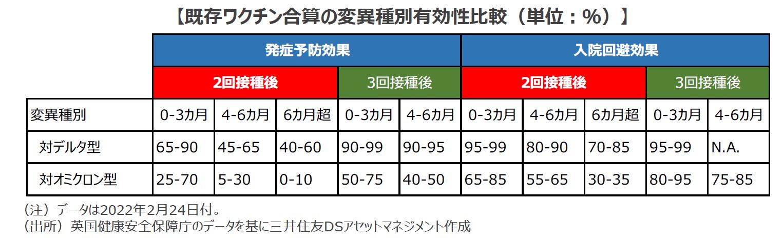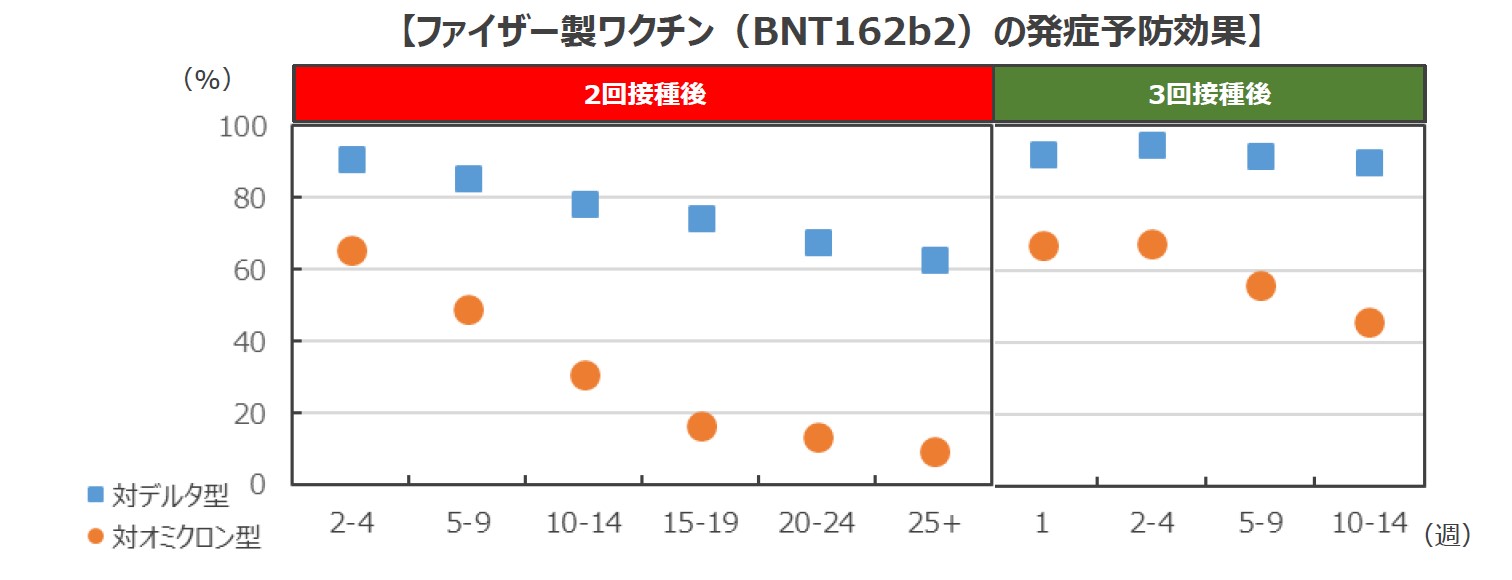 ■英国健康安全保障庁(UKHSA)が行った調査では、既存ワクチンを2回接種してもオミクロン型感染者の発症や入院を減らす効果はデルタ型に比べて顕著に低いこと、また、3回目のブースター接種を行ってもデルタ型ほどには効果が出ないことが報告されています。