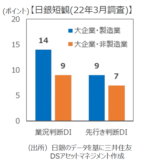 ■4月1日に発表された『日銀短観』では、最も注目される大企業・製造業の業況判断DI(回答のうち「良い」から「悪い」を引いた割合)は、前回調査から▲3ポイントの+14ポイントとなりました。2020年6月調査以来、7四半期ぶりの悪化となりましたが、事前の市場予想よりも底堅い結果となりました。また、大企業・製造業の先行き判断DIは+9ポイントと、足元の+14ポイントからは5ポイントの悪化が見込まれています。一方、大企業・非製造業の業況判断DIは同▲1ポイントの+9ポイント、先行き判断DIは+7ポイントとなりました。
