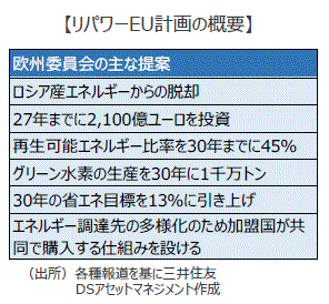 ■EUの欧州委員会は5月18日、ロシア産エネルギーからの脱却と温暖化ガス排出削減の目標達成に向けた「リパワーEU」計画の詳細を公表しました。「リパワーEU」計画は、『再生可能エネルギー』の大規模な普及と、エネルギー効率の改善、石油・ガスの調達先の多様化を提案しています。2027年までに2,100億ユーロ(約29兆円)規模の追加投資を行う見通しです。