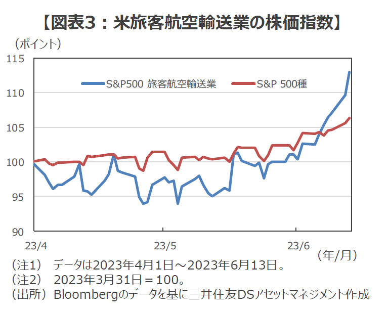 ■こうした予想利益の上昇を背景に、米国株式市場では、旅客航空輸送業で構成する指数が、市場全体を表すS&P500種株価指数を、足元で大きく上回り、堅調に推移しています。