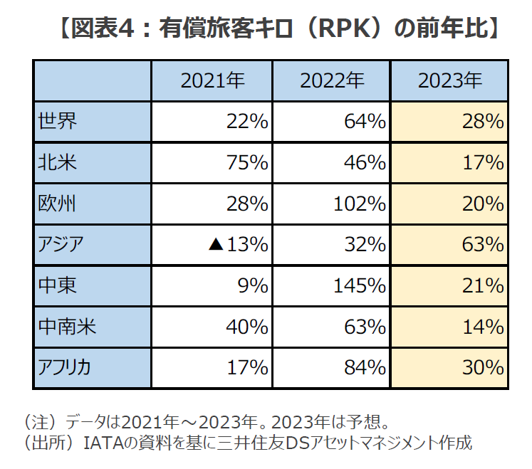 ■同協会によれば、乗客を実際に運ぶ規模を示す、2023年の「有償旅客キロ(RPK)」は、世界で前年比28%増が見込まれています。地域別では、コロナの行動制限の緩和が進んだアジア太平洋地域が同63%増と、回復率が最も大きくなっています。