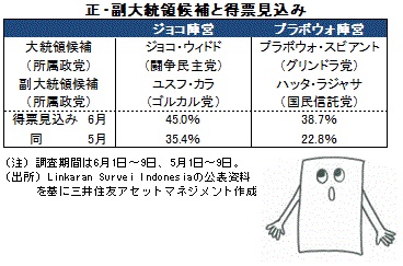 ジョコ・ウィドド候補は優勢を維持しています。同候補は、汚職防止を訴えるなど清廉なイメージが好感され、また、知事時代の実績から経済構造改革への期待が高いと見られます。ただし、プラボウォ・スビアント候補は、メディアを通じた選挙活動などにより急速に追い上げており、両陣営の得票は僅差となりそうです。