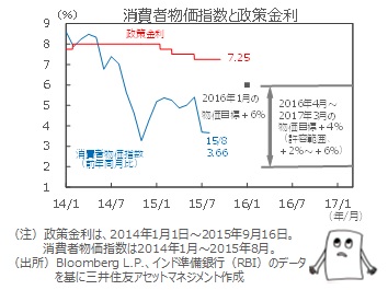 インド準備銀行(中央銀行、RBI)は、今年1月、3月、6月に「利下げ」を行い、政策金利を現在7.25%としています。物価がRBIの目標である年+6%(2016年1月時点)を下回り、安定していることが背景です。ラジャンRBI総裁は、6月に物価が上振れたことなどから8月の前回会合で政策金利を据え置きとしましたが、足元では追加「利下げ」期待が高まっています。