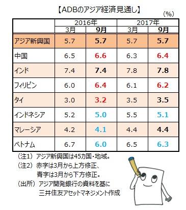 ■ADBは、日米欧の景気回復が遅れているものの、中国とインドの高い経済成長と外需の改善によって、アジアの経済成長は2017年に向けて拡大ペースを維持すると見ています。