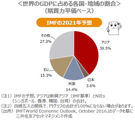 ■国際通貨基金( IMF )によれば、経済の持続的な成⻑によって、アジアは2021年に世界のGDPの約40%を占め、世界経済に対する影響⼒を一段と増していくと予想されています。