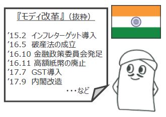 ■2015~16年にかけて、金融政策等に関して『モディ改革』が実施されました。まず、2015年2月にインフレ目標を4%±2%(2~6%)とする「インフレターゲット」が導入され、金融政策の透明性が向上しました。また、2016年10月には、更なる金融政策の透明性向上のため、「金融政策委員会」が発足しました。これにより、各委員の発言内容が議事録として公開されるようになりました。