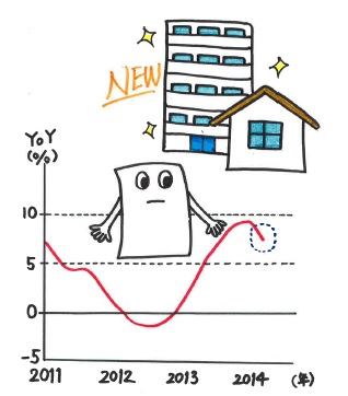 背景には、住宅販売額が年初から昨年実績を割り込んでおり、1-4月累計では前年同期比▲9.9%となったことなどが挙げられます。2013年通年の+26.6%から見ると、鈍化が目立ちます。