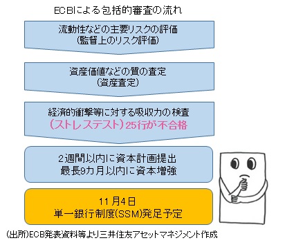 今回のストレステストは、大手銀行の資本不足が認定されなかったことや資本不足額を埋める手順も明確なこと等から、妥当な結果となりました。ECBはストレステストと資産査定を、単一銀行制度(SSM)(注2)発足に向けた大事な一歩としていただけに、市場には安心感が広がると期待されます。 11月4日からいよいよSSMが発足する予定です。