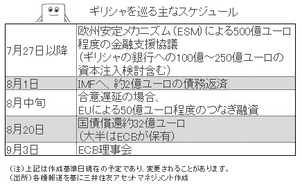金融支援協議が8月20日のECBへの返済期日を過ぎても合意に至らない場合、50億ユーロ程度のつなぎ融資をEUが約束しています。ギリシャの追加の改革法制化が大幅に遅れ、再び市場が不安定化しないよう、早期の合意が期待されます。