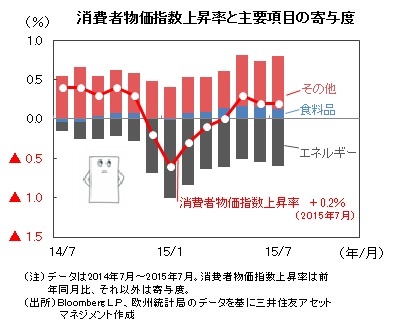 中国はユーロ圏にとっての最大級の輸出国であり、その景気減速は、景気と物価の両面で、ユーロ圏経済に影響を及ぼします。また、8月の人民元切り下げは、対ユーロでも5%超となり、中国の購買力への影響も懸念されます。ユーロ圏の景気回復の弱さから、物価は低位での推移が続きそうです。