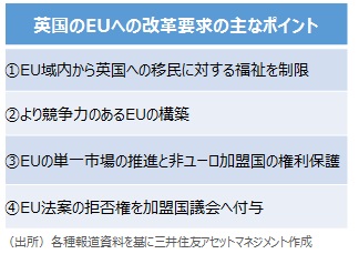 ■同首相は、改革がEUと合意された場合、「EU残留を支持」し、合意されなかった場合、「いかなる案も排除しない」考えです。改革要求に対するEU内の合意形成が、「英国のEU離脱」を回避する鍵です。