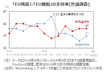 為替市場では、英ポンドが国民投票の実施日決定直後、対ドルで急落し、その後反発するなど、変動が高まりました。国民投票までまだ3カ月以上あり、両派のかけひきが活発化することも予想されます。今後は、金融市場の不透明感が高まる可能性に注意が必要と見られます。