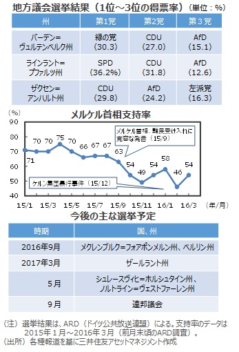 ■また、昨年大晦日にケルンで難民による集団暴行事件が起こり、回復傾向にあった首相支持率は2月に大きく低下しました。3月の調査で首相支持率は幾分回復したものの、3月の選挙では首相の政策への批判票の大きさが改めて示されました。