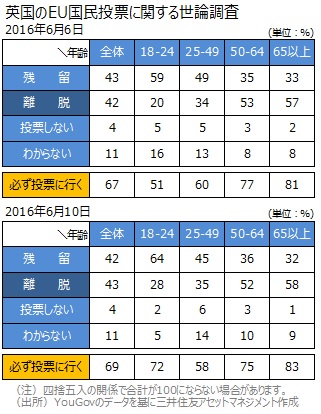 ■また、若年層の「必ず投票に行く」の割合が大きく増加(51%⇒72%)しています。「経済重視」で「残留」派の多い若年層の投票率が上昇すれば、「残留」の可能性が高まると期待されます。