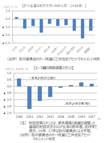 ■ユーロ圏の「財政政策」スタンスは、2011年から14年までは景気に対して緊縮的でしたが、15年にはほぼ中立的となり、今年は対GDP比+0.3%と小幅ながら景気に対して刺激的になる見込みです。これは、難民の受け入れと、反欧州連合(EU)感情の高まりへの配慮が作用していると見られます。反EU感情については、高まるEU主導の緊縮的な経済運営への反感を和らげるために、財政ルールはそのままに、実態としての財政赤字を容認する形での財政支出増となっている模様です。先日の英国のEU離脱となる国民投票を受け、反EU感情を抑えるための財政支出増加に拍車がかかる可能性があります。