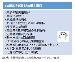 ■メイ首相は17日、「EU単一市場」から完全離脱する政府方針を表明しました。「EU単一市場」への参加よりも移民規制や司法権独立などを優先する方針です。EUとは、新たな自由貿易協定を締結することを目指します。メイ首相は演説で、「より強く、より公正で、グローバルな英国」を交渉の基本理念とし、これに沿った交渉上の12の優先項目を示しました。