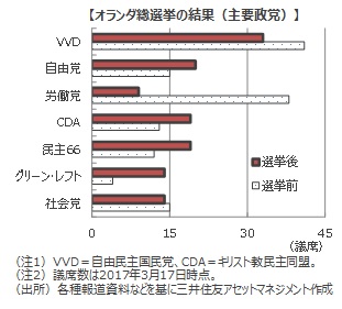 ■今回の選挙で勝利したVVDは単独過半数を獲得できなかったことから、今後はVVDを中心に連立交渉が進むと見られます。VVDを除くと、各党の獲得議席数は全体の20%未満であることから、4党程度での連立政権となることが予想されます。過去の例を見ると、連立交渉には数カ月を要しており、今回も連立交渉には時間がかかりそうです。今回の「オランダ総選挙」では、極右の自由党は第一党とならずとも、なお存在感を残しました。今後は、フランス大統領選挙など、年内に欧州で予定される選挙でポピュリズムの勢いが続くのかにも注目です。