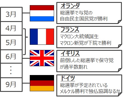2017年は欧州各国で重要な選挙が目白押しの『選挙イヤー』です。昨年英国がEU離脱を選択したことに代表される、欧州でのポピュリズムの高まりがどのような選挙結果となって表れるかがその一つの焦点となっています。『選挙イヤー』の上半期を振り返ると極右政党の政権奪取はなく、金融市場等では一定の安心感が広がっています。今回は『選挙イヤー』の下半期に向けて、これまでの動向を改めて整理してみましょう!