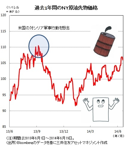 6月に入ると、「イラク」が新たな地政学リスクとなりました。イスラム教スンニ派の反政府勢力が、同シーア派政権の軍隊と衝突し、対立が激化しています。南部の主要な油田にはまだ衝突が及んでいないとされますが、影響を恐れた外資企業の社員が一部退避を始めたとも伝えられ、供給縮小を懸念させる要因となっています。