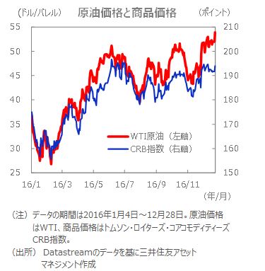 ■原油需給は緩和の状態が続いていますが、①産油国の間で協調減産に向けた動きが台頭し、12月にはOPEC(石油輸出国機構)と非加盟国との間で、01年以来15年ぶりとなる協調減産の合意が成立した、②北米のシェールオイルの生産減少が続いた、などが評価されたと考えられます。