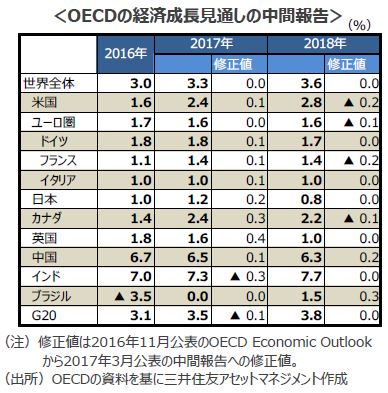 ■3月7日、OECDは「経済成長見通し」の中間報告を公表しました。これによると世界全体の実質GDP成長率の見通しは、2016年は前年比+3.0%、2017年は同+3.3%、2018年は同+3.6%と、今後は先進国の財政主導により緩やかながら成長スピードが加速すると見られています。なお、世界全体の見通しは前回2016年11月の公表分から据え置かれました。