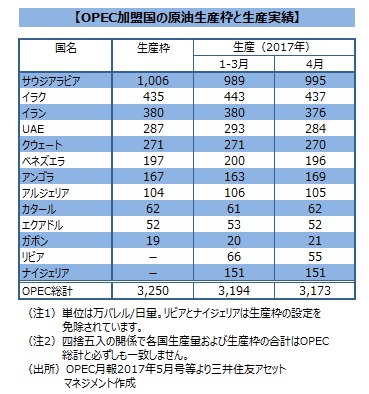 ■OPEC月報17年5月号によれば、4月のOPEC原油生産量は日量3,173万バレルでした。16年11月の臨時総会で合意に達した生産枠である同3,250万バレルに対し、77万バレル低い水準です。1-3月期実績の同3,194万バレルとの比較では、同21万バレルの減産となります。