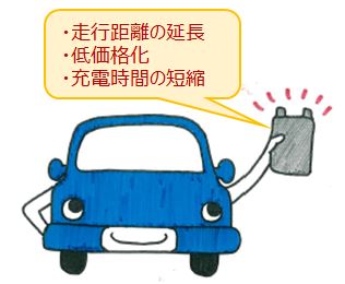 ■電気自動車の本格普及には、エネルギ-密度の引上げによる現在300km程度の走行距離の延長、低価格化、充電時間の短縮などリチウムイオン電池の性能向上を進めていく必要があります。