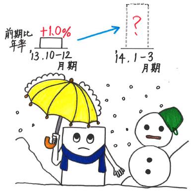 ただし、中間評価は2013年度の成長率が前年度比+2.7%程度との前提に基づいています。今回のGDPの下振れにより、その実現には2014年1-3月期が前期比+3.0%程度(年率+12%程度)の極端な高成長となることが求められます。市場では増税前の駆け込みがあっても前期比+1.1%程度と見る向きが多く、その場合、2013年度の成長率は前年度比+2.2%となります。足元の寒波で首都圏の活動が停滞したこと、年初から日本株が下落したことなども踏まえると、日銀は見通しの下方修正を迫られそうです。