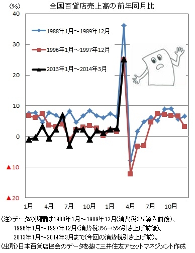 初めて3%の消費税が導入された1989年、5%へ消費税率が引き上げられた1997年は、ともに3月が前年同月比で大幅な増加になり、4月はその反動で減少しましたが、いずれも年半ばから増加に転じました。