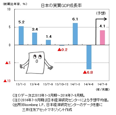 ■13日に内閣府が発表した「2014年4-6月期のGDP(第1次速報値)」によると、同期の実質GDP成長率は、前期比▲1.7%、年率換算では▲6.8%と、2四半期ぶりにマイナス成長となりました。消費税増税の影響により、自動車や家電など耐久消費財を中心に個人消費が大きく落ち込んだことなどが影響しました。