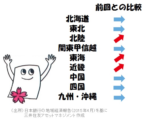 ■日銀は13日、「さくらレポート」を発表しました。近畿、東海、北陸の3地域の景気判断を前回1月の報告から引き上げました。景気判断が上方修正されたのは、消費税率引き上げ後初めてです。残る6地域の景気判断は据え置かれ、「回復」が維持されました。全ての地域で「消費税率引き上げ」の文言が削除され、消費税率引き上げの影響が薄れつつあることがうかがわれます。また、多くの地域で生産の持ち直しや雇用・所得の改善が見られました。