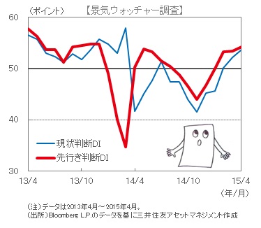 訪日外国人旅行者の増加や賃金の上昇期待などにより、全国的に景況感は改善しています。訪日外国人旅行消費額(観光庁の推計値)は、2015年1-3月期で前年同期比64%増の7,066億円と大幅に増加しました。「インバウンド消費」は、「街角景気」にも実感として反映されてきており、消費の下支え要因として期待されます。
