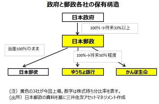 11月4日に「郵政3社」の株式上場が予定されています。ゆうちょ銀行、かんぽ生命、そしてこれら2社の親会社にあたる日本郵政です。上場前の株式売り出しにより約1.4兆円の資金を集めるうえ、3社それぞれの時価総額は6.5兆円、1.3兆円、6.3兆円程度と推定され、1987年のNTT以来の大型上場です。配当利回りが相対的に高く、上場前の売り出しへの申し込みが多かったこともあり、株式市場では大きな話題となっています。