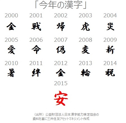 ■この他にも、イスラム過激派による邦人人質事件、パリの同時多発テロ事件など、人々の“安”全が脅かされる事態が続いたこと、さらにはマンションで杭打ちメーカーのデータ改ざんや海外自動車メーカーの排ガス規制に関する不正など、暮らしに関連するものの“安”全を揺るがす事件が続いたことも選出の理由にあげられています。お笑いタレントの「“安”心して下さい、穿いてますよ。」が人気を博したことも理由の一つのようです。