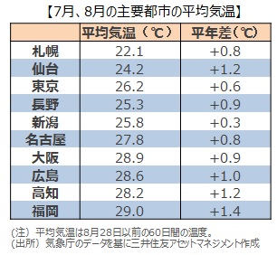 気象庁は先行き1カ月、3カ月を対象に大まかな天候を予想し、「季節予報」として発表しています。今年の夏は、「季節予報」の見通し通り、西日本を中心に猛暑となりました。個人消費は最近停滞していますが、猛暑効果により、エアコン、飲料、衣料などの季節商品の購買意欲増加により、個人消費の押し上げ効果が期待できます。