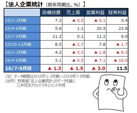 ■財務省は1日、2016年7-9月期の「法人企業統計」を発表しました。全産業(金融・保険業除く)の設備投資の伸び率は前年同期比▲1.3%と、14四半期ぶりに減少しました。業種別で見ると、製造業は、情報通信機械や生産用機械などの減少が影響し、同▲1.4%となりました。また非製造業は、建設業の減少が大きく、次いで情報通信業、物品賃貸業などの減少が影響し、全体では同▲1.3%となりました。