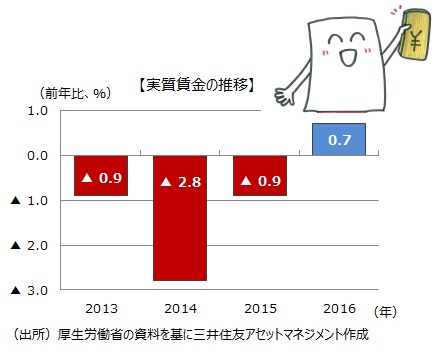 ■2016年通年の「実質賃金」は前年比+0.7%と、2011年以来5年ぶりにプラスとなりました。名目賃金が同+0.5%と3年連続の増加となったことに加え、円高や原油安の影響から物価が下落したことから「実質賃金」の増加となりました。