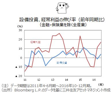 ■財務省は1日、2016年10-12月期の「法人企業統計」を発表しました。全産業(金融・保険業除く)の設備投資の伸び率は前年同期比+3.8%と、2四半期ぶりのプラスとなりました。業種別では、製造業が同+7.4%、非製造業が同+1.9%と、いずれも前期のマイナスからプラスに転じました。