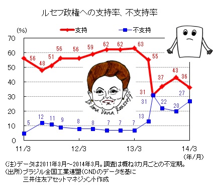 ルセフ政権への支持率は、昨年6月頃に一時激化した反政府デモやストライキの動きなどを受けて大幅に低下し、足元でも低迷しています。ルセフ氏への支持率は野党の候補者を上回っていますが、景気やインフレへの懸念などから、選挙戦が接戦になるとの見方が出ています。