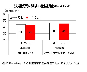 2010年に就任した現職のルセフ大統領の任期(4年)満了を控え、大統領選挙が実施されています。10月5日に実施された第1回投票で過半数の票を獲得した候補者が出なかったことから、10月26日に決選投票が行われます。決選投票は、第1回投票で得票率トップ(41.6%)のルセフ氏と、2位(33.6%)のブラジル社会民主党(PSDB)のネーベス氏の2名の対決になります。