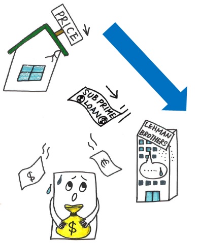 ■2000年から2006年にかけ、米国では長期の金融緩和と低所得者向けの住宅ローン(サブプライム・ローン)の盛行を背景に住宅ブームが加速しました。サブプライム・ローンは、住宅価格の値上がりを前提にした、支払能力の低い個人向けの住宅ローンで、大きく拡大しました。このローンを担保とした「住宅ローン担保証券」や一般の貸付債権などと組み合わせた「債務担保証券」が世界中の投資マネーを集めました。2006年後半から米国の住宅価格が下落を始めると、ローンの返済率が悪化し、そうした証券化商品の価格が大幅に下落することになりました。