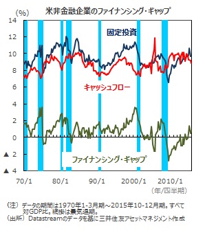 ■FRBの財務勘定統計によれば、2015年10-12月期の米非金融企業のファイナンシング・ギャップは、年間ベースに換算すると1,451億ドル、対GDP比で+0.80%でした。4四半期連続のプラスであり、しかもプラス幅は拡大基調にあります。企業の投資が継続的に自己資金を上回ってきたことを意味するものです。