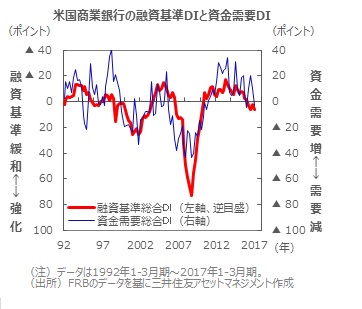 米連邦準備制度理事会(FRB)は、商業銀行の融資担当責任者を対象に、銀行の「融資基準」や借手の資金需要の動向に関するヒアリング調査(Senior Loan Officer Opinion Survey)を四半期ごとに実施しています。人間に例えれば血液に相当する資金が、経済の中を正常に循環しているかどうかを検査するのが目的です。直近の調査は国内銀行70行を対象に、2016年末から17年の年初にかけて実施されました。