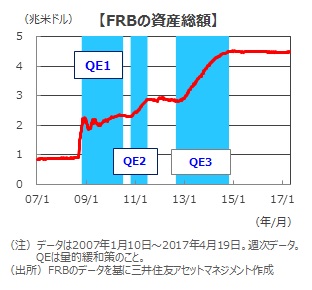 米連邦準備制度理事会(FRB)は、2008年のリーマンショックを契機とする戦後最大級の景気後退に対処するため、債券の大量購入によって市中に資金供給を行ってきました。その結果、景気後退前は8,800億ドルに過ぎなかったFRBの「バランスシート」は4兆5,000億ドルまで拡大しました。景気が回復軌道に乗った現在、膨らんだ「バランスシート」の圧縮がFRBの課題となっています。