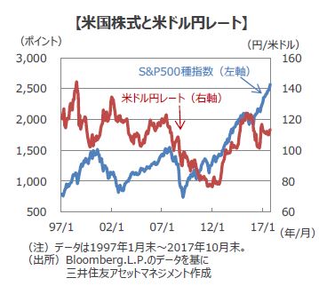 ■米国株式市場は、ここ数年は堅調に推移しています。代表的な株価指数のS&P500種指数は、今年初から高値更新が続いています。しかし、過去20年間を振り返ると、2000年後半から2002年にかけてはITバブルの崩壊、2008年9月にはリーマン・ショックと2度の大きな調整局面がありました。しかし同指数は1997年1月末の786.16ポイントから、2017年10月の2,575.26ポイントまで上昇しました。また、米ドル円レートは147円台から75円台まで大きく上下しました。