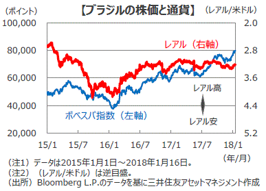 ■ブラジルの株式市場は17年半ばから上昇傾向にあり、18年に入っても好調さを維持しています。主要株価指数のボベスパは、足元で連日過去最高値を更新しています。世界的な景気拡大と低水準の金利を背景にした株高基調の中、投資資金が流入していることが要因です。